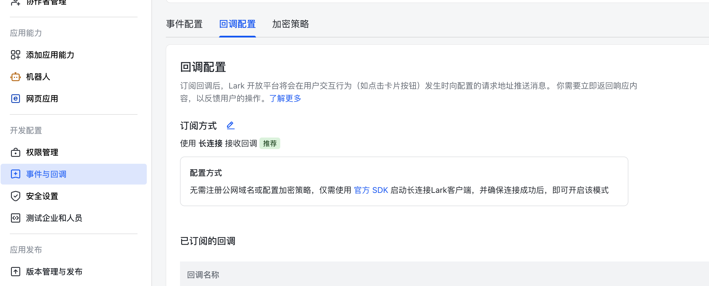 Lark 后台配置机器人本文不赘述,将事件与回调里回调配置改为长链接即可。